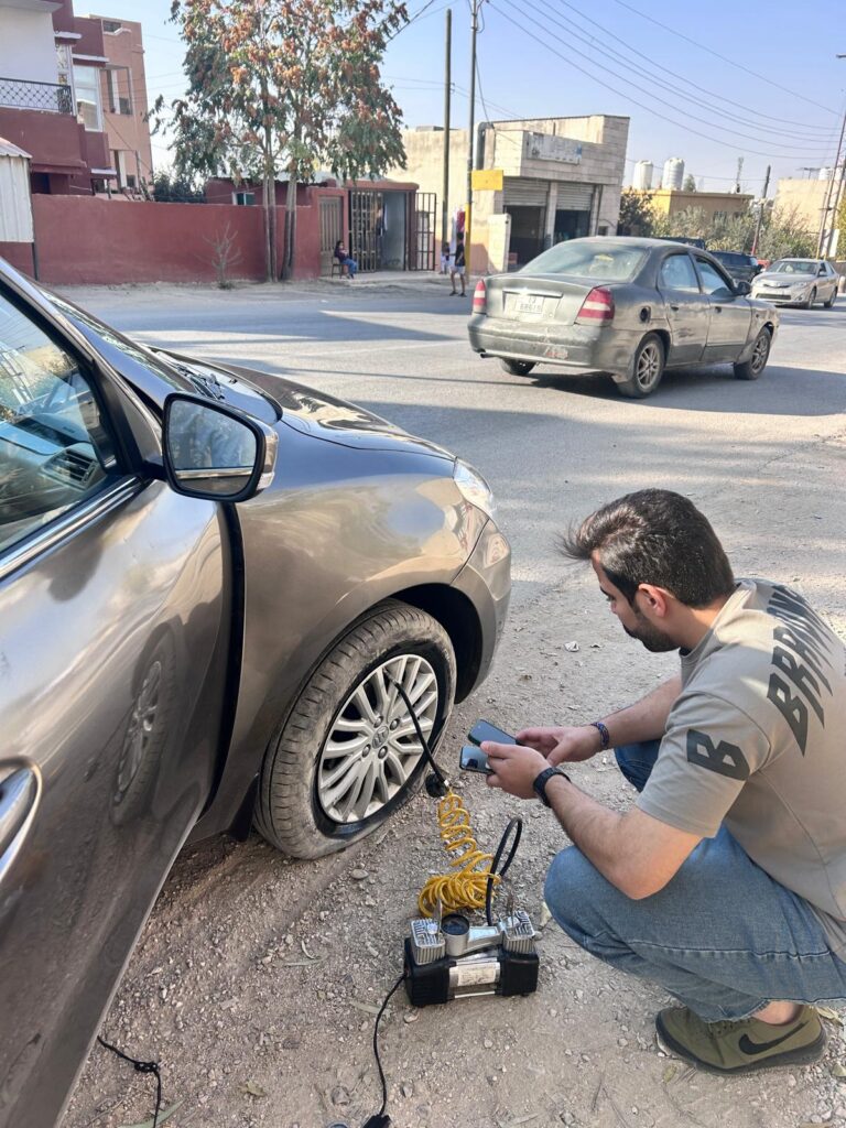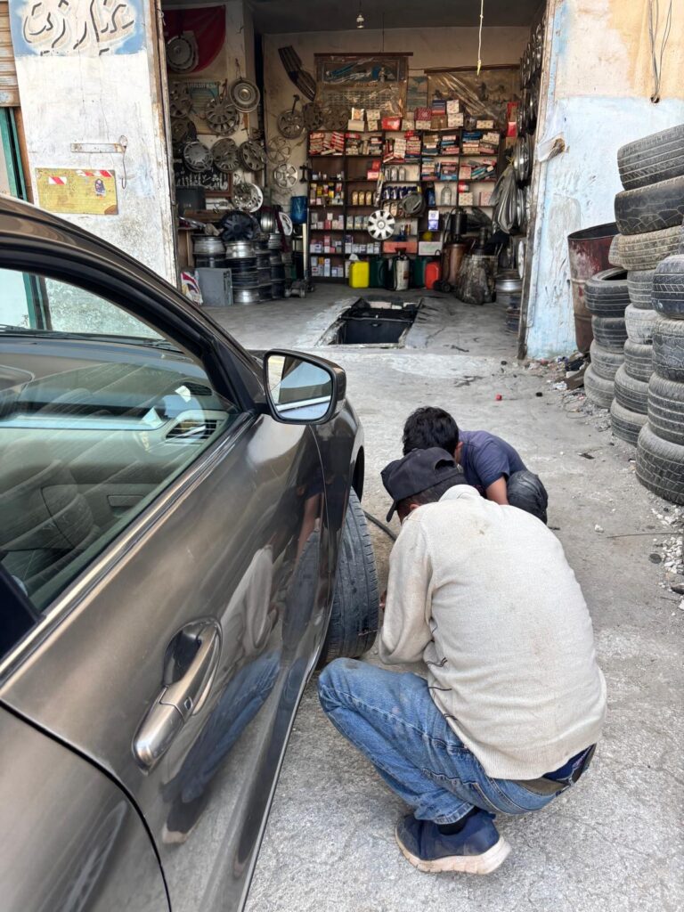 Jenže po pár sekundách si Lukáš všiml, že auto se chová divně, tak jsme zastavili na krajnici a viděli úplně prázdné kolo. Během chviličky přiskočili dva místní kluci s kompresorem a snažili se ho dofouknout, jenže to díky zaraženému hřebíku nešlo. Jeden z nich sedl do auta a řekl, ať jedeme za ním do servisu. Během 2 minu jsme byli u servisu, kde vše vysvětlil staršímu pánovi, který tam měl synka nebo vnuka, to se špatně poznává. Ti se na nic neptali a hned hřebík vyndali, opravili díru, nafoukli… a v tu chvíli zjistili, že je tam díra další, na kterou už ale zřejmě neměli vybavení, takže vyházeli k kufru věci, vyměnili pneumatiku za rezervní kolo, ať si to necháme opravit někde jinde. Všichni byli úplně zlatí a milí.