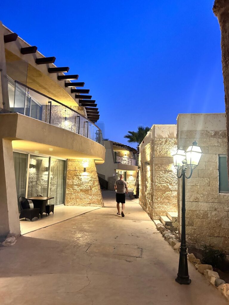 Jeli jsme tedy dál směrem do našeho hotelu O Beach hotel & Resort, kde jsme si přes Booking zamluvili dvě noci se snídaní za 4 000 Kč. Hotel je na útesu nad soukromou pláží mrtvého moře. Pokoj je obrovský, s terasou v krásném a čistém resortu, který se dále rozšiřuje. Chvíli jsme si odpočinuli, podívali se na pláži na západ slunce, poleželi u bazénu a pak si dali skvělou večeři v podobě jordánských mezze (výběr z několika předkrmů) a místní pivo s názvem Petra.