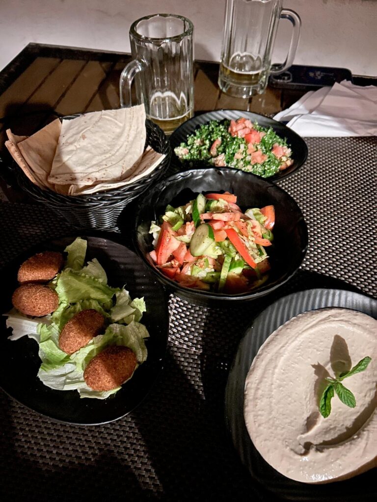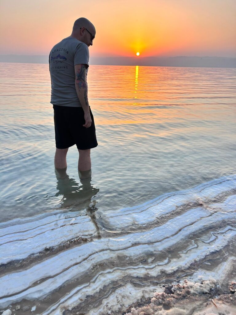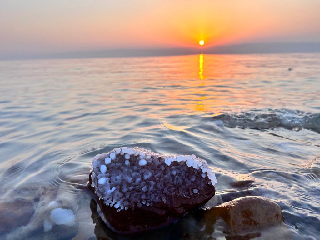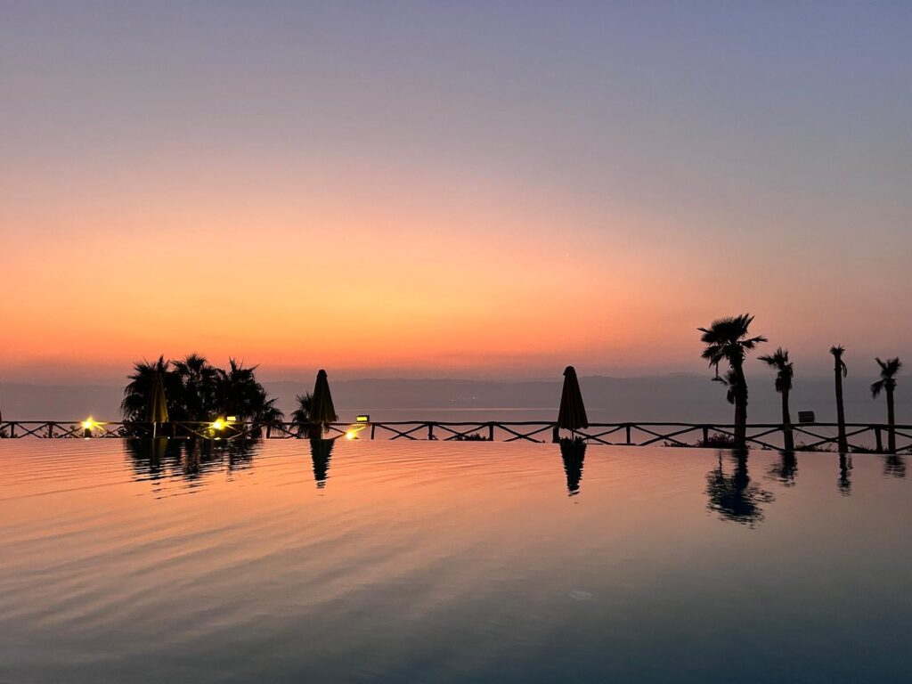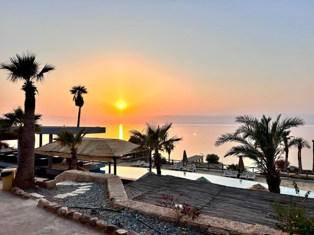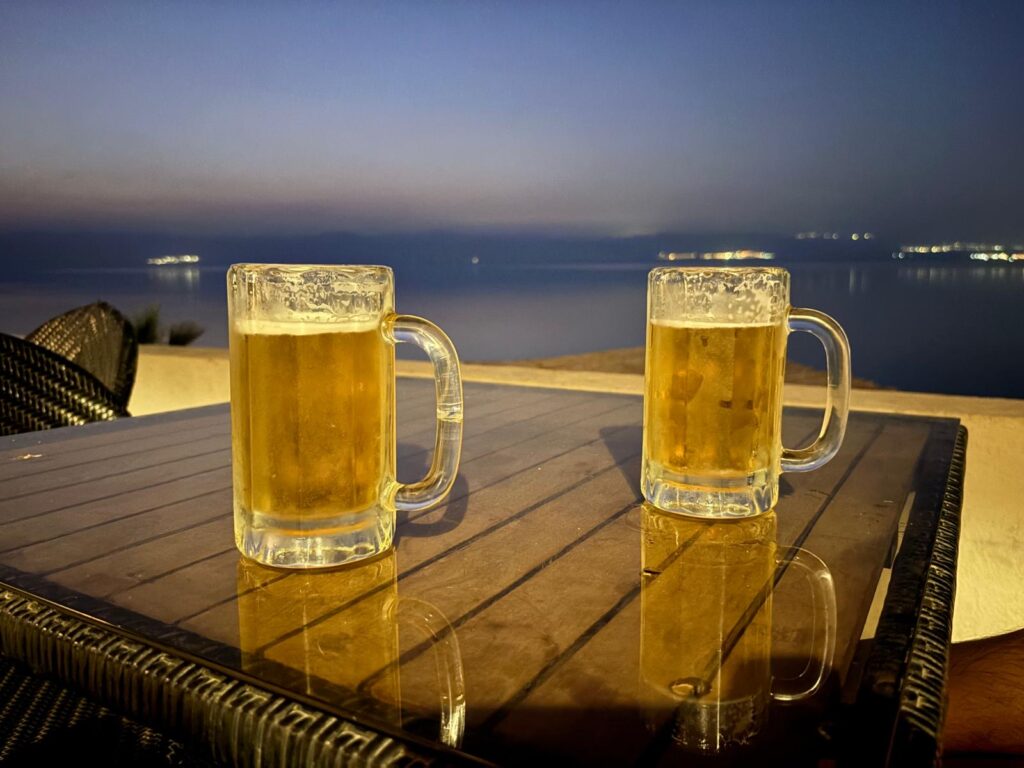 Jeli jsme tedy dál směrem do našeho hotelu O Beach hotel & Resort, kde jsme si přes Booking zamluvili dvě noci se snídaní za 4 000 Kč. Hotel je na útesu nad soukromou pláží mrtvého moře. Pokoj je obrovský, s terasou v krásném a čistém resortu, který se dále rozšiřuje. Chvíli jsme si odpočinuli, podívali se na pláži na západ slunce, poleželi u bazénu a pak si dali skvělou večeři v podobě jordánských mezze (výběr z několika předkrmů) a místní pivo s názvem Petra.
