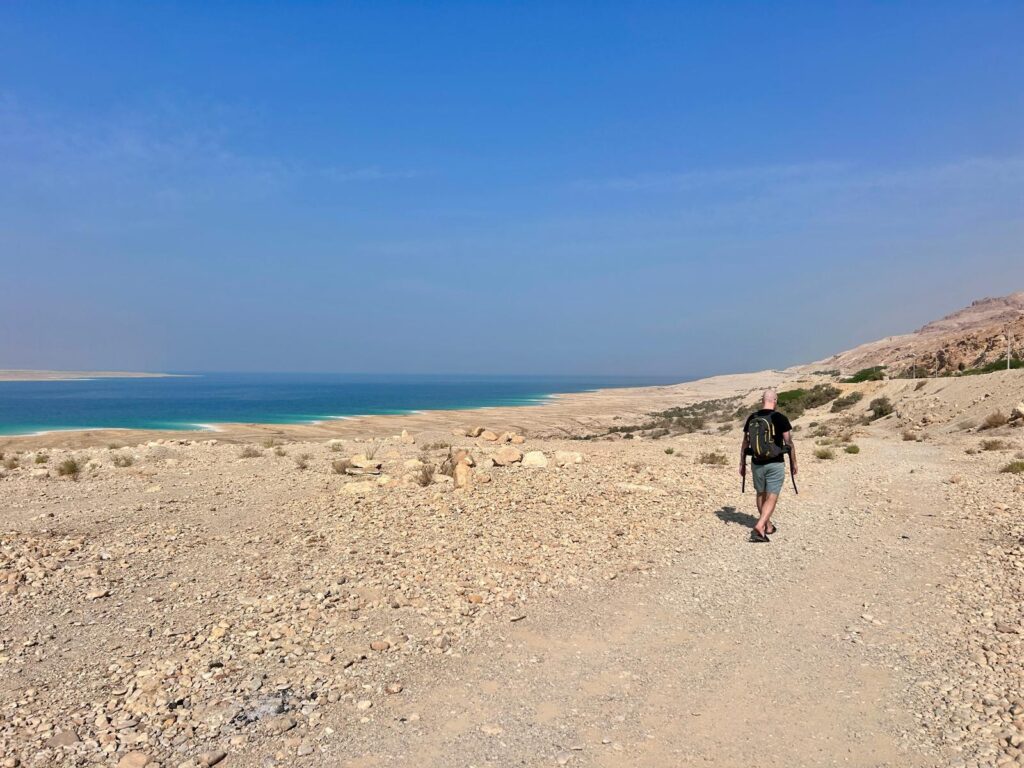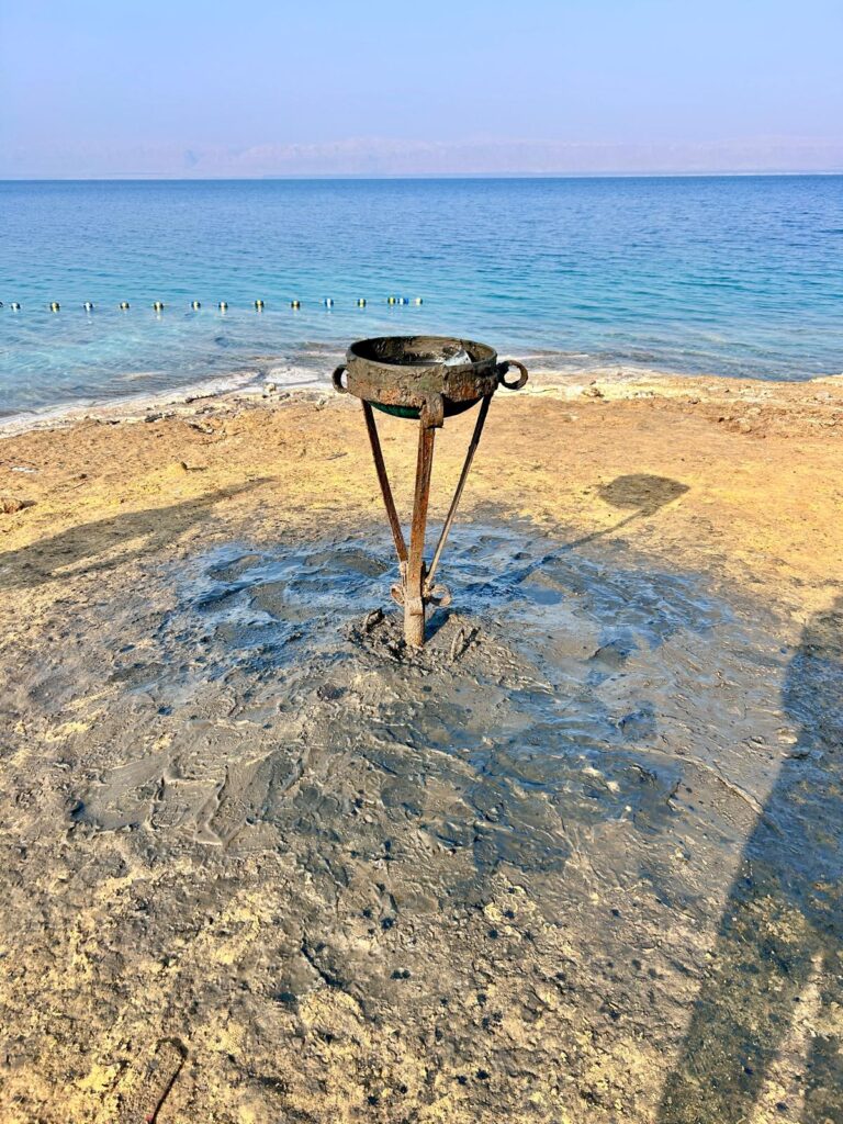 Dali jsme si budík na 7. hodinu, abychom byli první na snídani a hned po ní jsme si mohli užít osamocenou hotelovou pláž, ke které vedlo 200 schodů od našeho pokoje. Na pláži byla i káď s bahnem z mrtvého moře, takže jsme se tím pořádně napatlali a pak šli hned vyzkoušet, jak je to s tou slaností a hustotou vody. A je to teda fakt neskutečný pocit. Potopit se v tom opravdu jen tak nedá a automaticky voda vytlačuje tělo do polohy vleže. Chuť vody, a to jak pálila na rtech a vlastně celém obličeji je něco nezapomenutelného. Naštěstí na všech plážích, i těch mimo hotely, jsou sprchy, protože bez toho by se to nedalo vydržet.