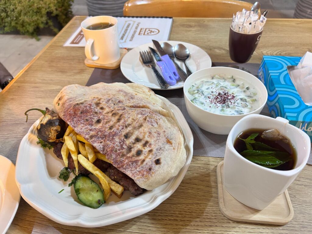 Abychom si užili i tady západ slunce, šli jsme k nám do hotelu, dali jsme si pivo a užívali si krásný výhled do údolí. To jsme ještě nevěděli, že nám napálí cenu 240 Kč za jedno. No, poučení zní – nejprve se zeptat na cenu, pak teprve objednávat. Protože jsme chtěli večeři s trochu autentičtějším zážitkem, než je hotel, tak jsme vyšli na náměstí, kde jsme si sedli k moc pěkné restauraci, dali si jehněčí mleté špízy, zeleninu a čaj. Dostali jsme ještě zdarma místní speciální kávu, což je klasický turek s kardamomem (velice zajímavé chuťově). U toho jsme poslouchali svolávání na modlení do mešity a pozorovali děti, jak hrají fotbal uprostřed náměstí.