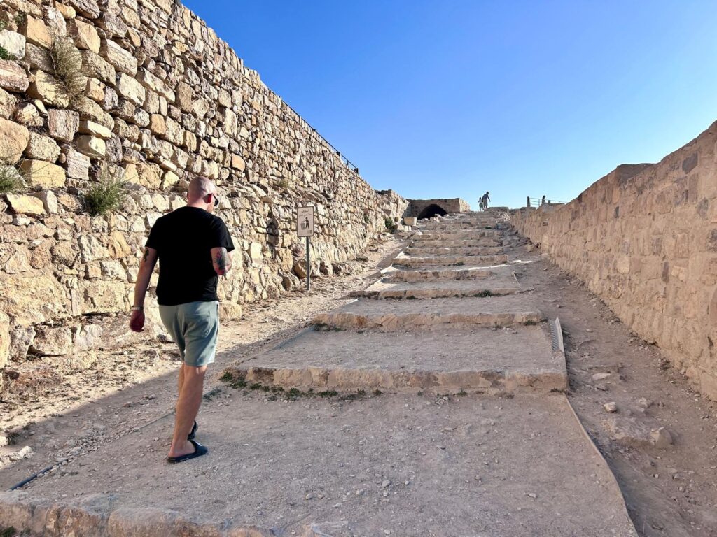 Vyšplhali jsme z 420 metrů pod hladinou moře do výšky 930 metrů nad hladinou moře, do jednoho z nejzajímavějších historických míst Jordánska. Al Karak je klidné a malé městečko v horách, je hodně autentické, turismus to není úplně přehnaný, místní jsou moc milí. Ubytovali jsme se v hotelu hned vedle hradu (1000 Kč pro oba se snídaní), který je velmi známý a významný, jelikož je to jedna z nejlépe zachovaných křižáckých pevností na Blízkém východě. Byl postaven v 12. století křižáky jako součást obranné linie mezi Jeruzalémem a Aqabou. Strategická poloha na skalním ostrohu s hlubokými údolími po třech stranách z něj dělala téměř nedobytnou pevnost.