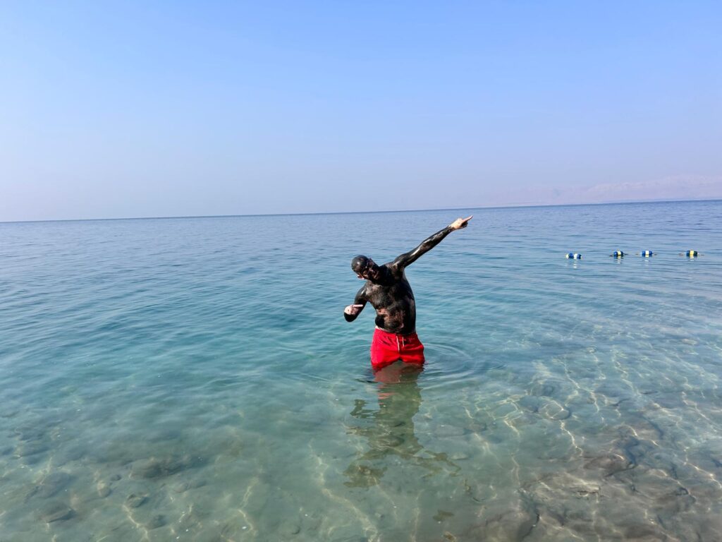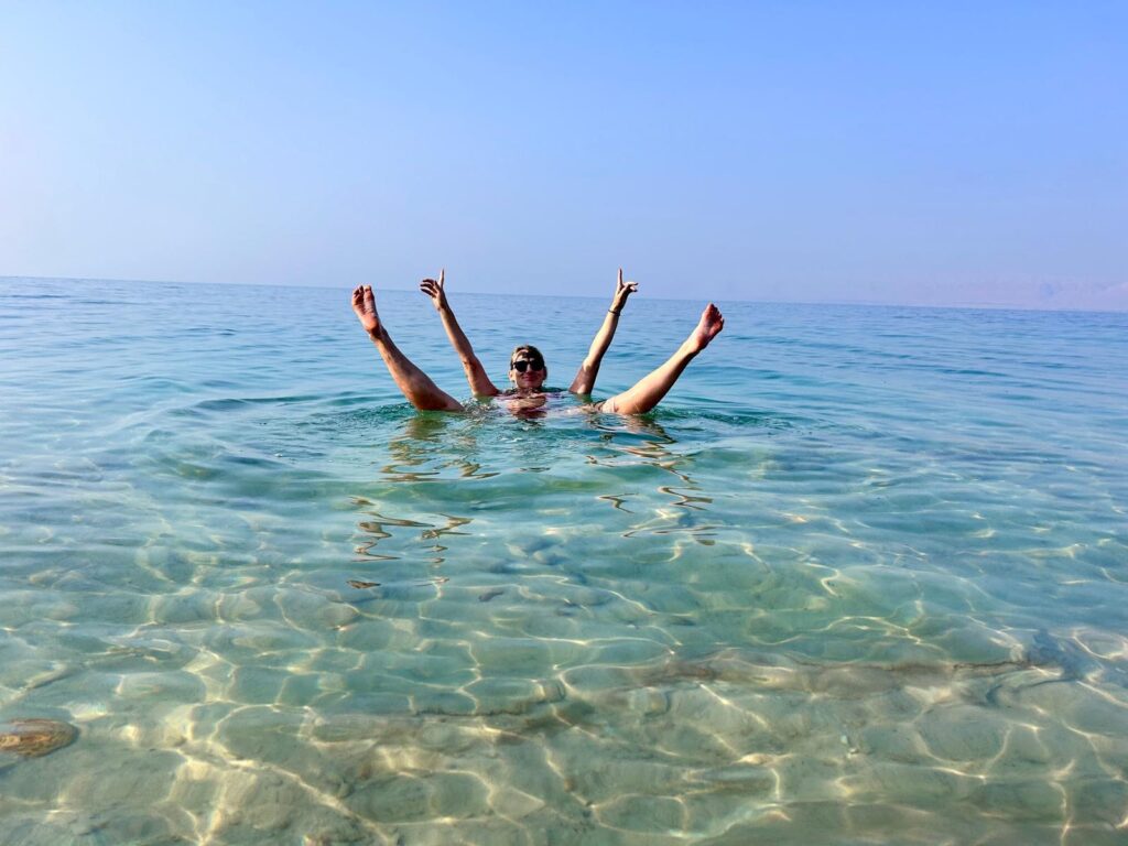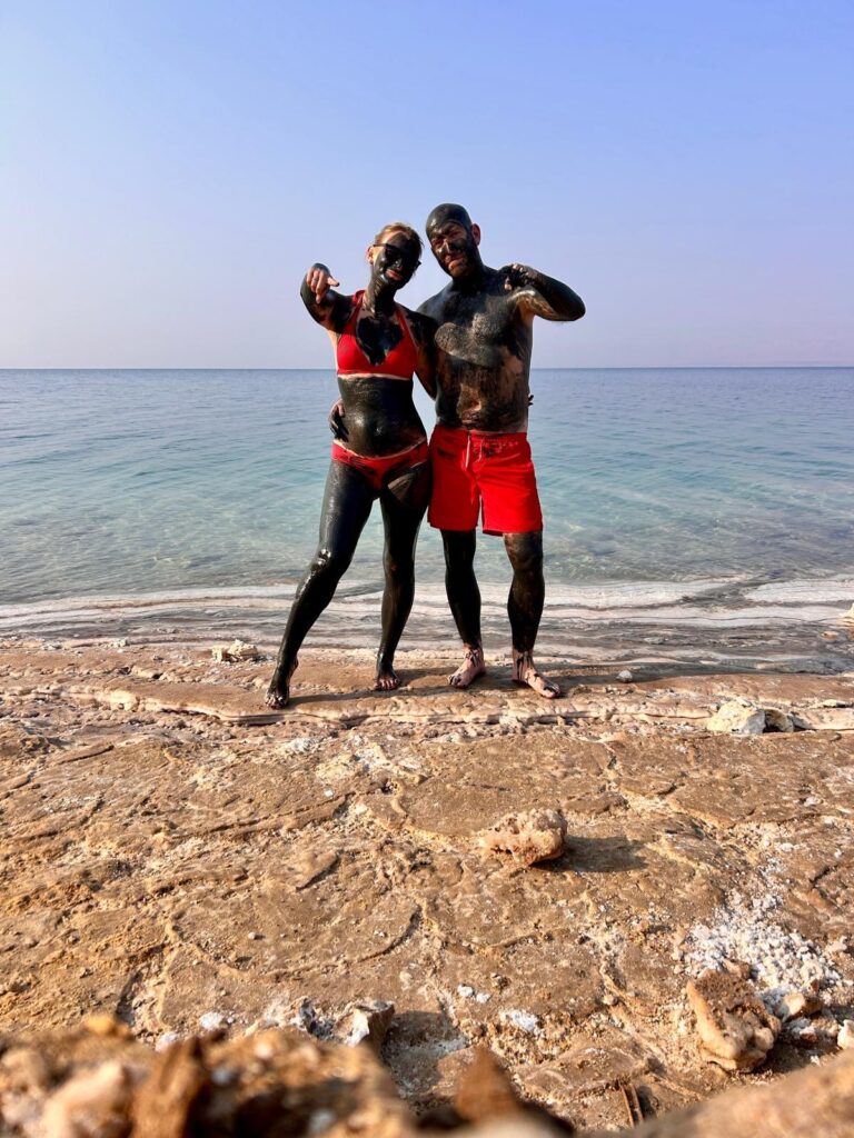 Dali jsme si budík na 7. hodinu, abychom byli první na snídani a hned po ní jsme si mohli užít osamocenou hotelovou pláž, ke které vedlo 200 schodů od našeho pokoje. Na pláži byla i káď s bahnem z mrtvého moře, takže jsme se tím pořádně napatlali a pak šli hned vyzkoušet, jak je to s tou slaností a hustotou vody. A je to teda fakt neskutečný pocit. Potopit se v tom opravdu jen tak nedá a automaticky voda vytlačuje tělo do polohy vleže. Chuť vody, a to jak pálila na rtech a vlastně celém obličeji je něco nezapomenutelného. Naštěstí na všech plážích, i těch mimo hotely, jsou sprchy, protože bez toho by se to nedalo vydržet.