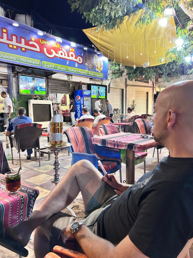 Po večeři jsme si sedli k jednomu z podniku, co nabízí shishu a současně se tam sledoval fotbal. Sedělo tem asi 40 mužů, co sledovalo fotbal, hráli domino, karty, pili čaj nebo džusy a kouřili shishu. Dali jsme si černý čaj a shishu a po jejich vzoru jsme si taky zabrali karty a sledovali jsme u toho fotbalový zápas.