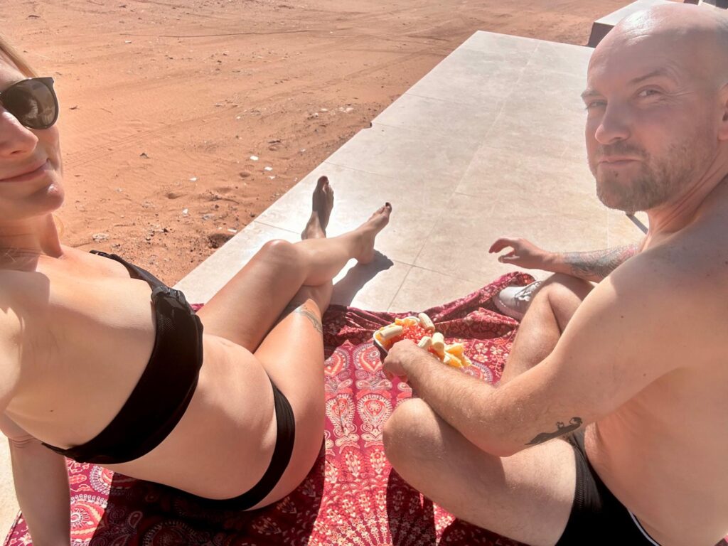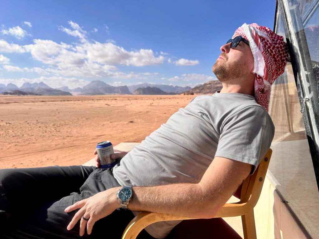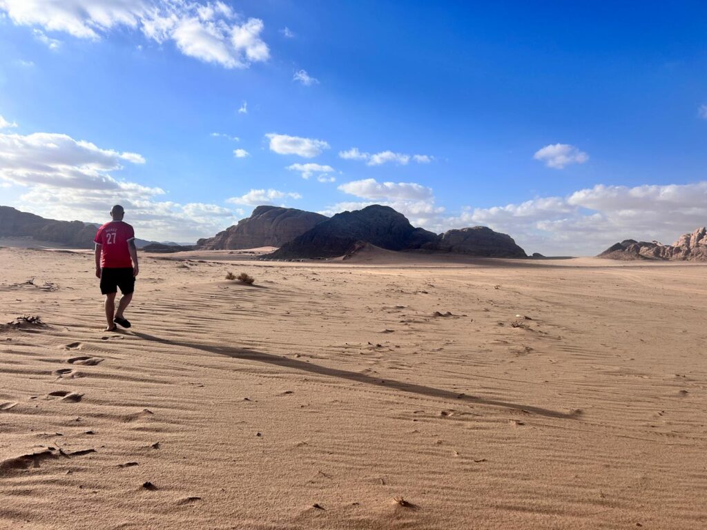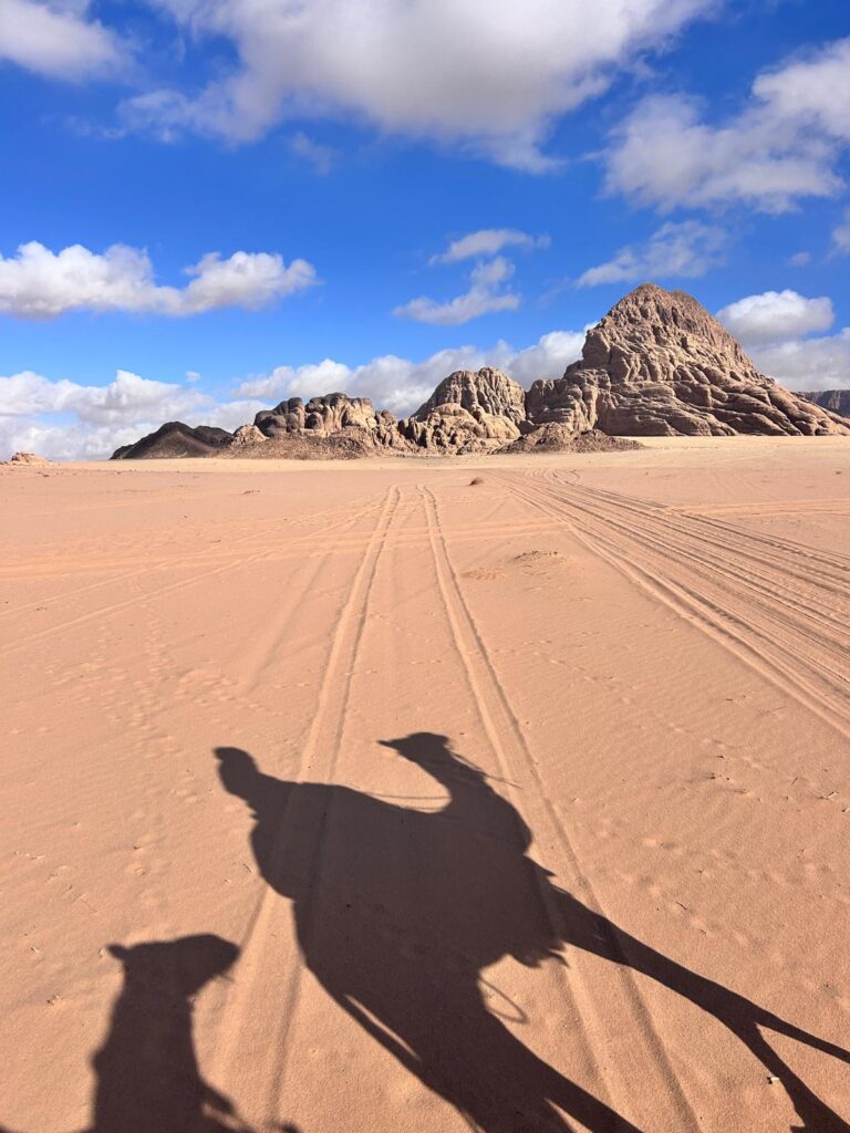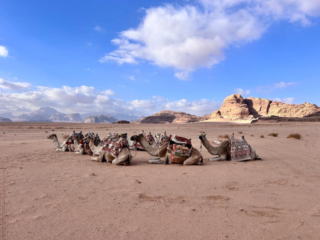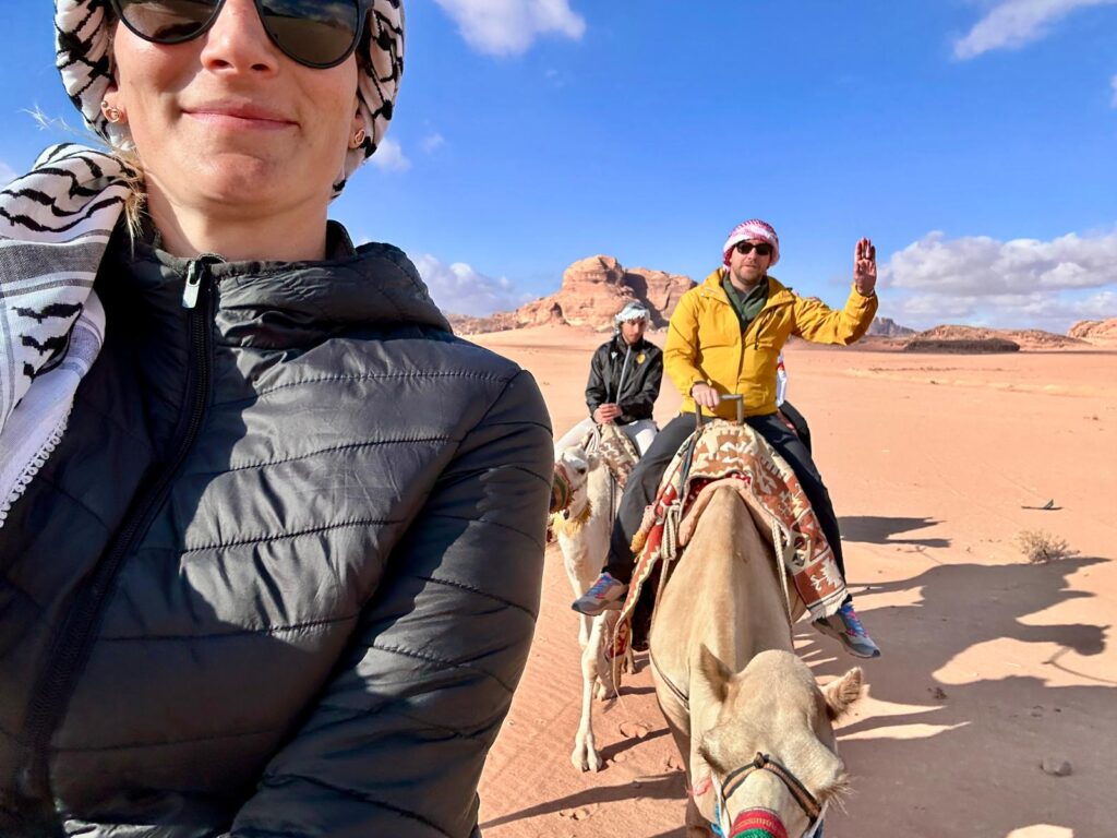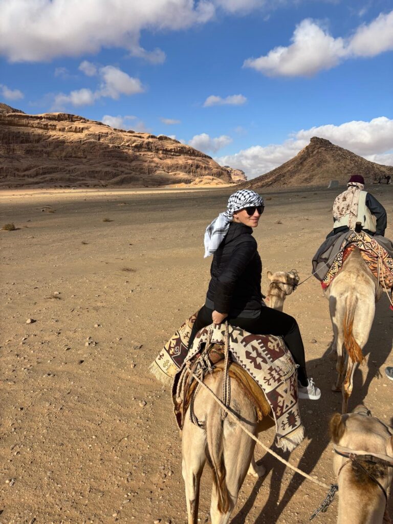 Nasedli jsme ještě s partičkou, co přijela z Kypru na velbloudy a vydali se po poušti. Je zajímavé, jak je v první chvíli jízda na velbloudovi nejistá a nestabilní, ale po půl hodině se to naštěstí zlepšilo. Dozvěděli jsme se pár dní před naši jízdou, že jsou zrovna nějací dva jordánci, co se rozhodli jet na velbloudech až do Mekky, což je asi 3000 km. No, my jsme byli rádi, že jsme nemuseli ujet ani 10 kilometrů. Zjistili jsme, že pan od velbloudu je ze Súdánu a do Jordánska přišel za prací.