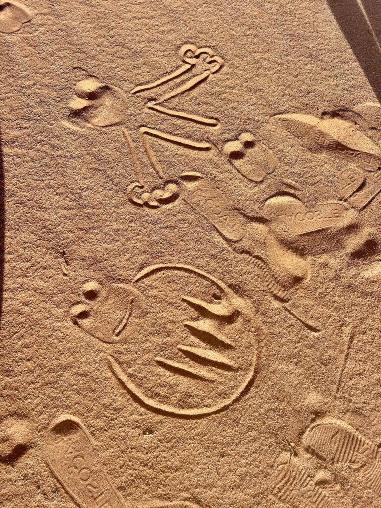 Po projížďce nás čekalo první úplně volné odpoledne. Leželi jsme u stanu, opalovali se, pouštěli si muziku, jedli ovoce, luštili křížovky, četli knihu, dali si odpolední spánek a těsně před západem slunce jsme se šli projít po poušti za krásného světla, kdy slunce jde za hory. Po ceste jsme luštili různé stopy v písku a ze stop velbloudů jsme dělali obrázky žab.